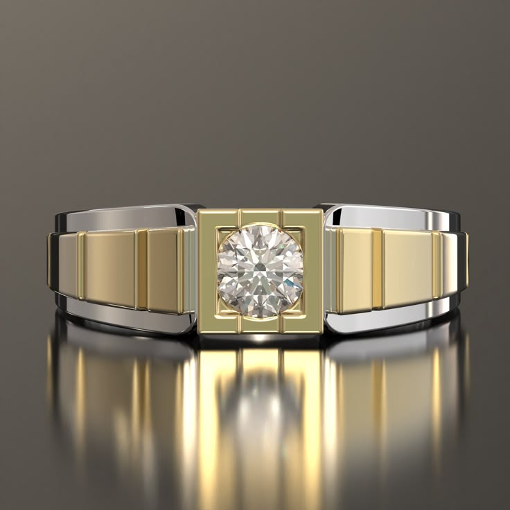 This ring embodies strength and authority with its bold square bezel setting that securely holds a brilliant-cut solitaire diamond. The combination of yellow and white gold enhances its versatile appeal, while the structured design makes it a standout choice for men who value confidence and class.